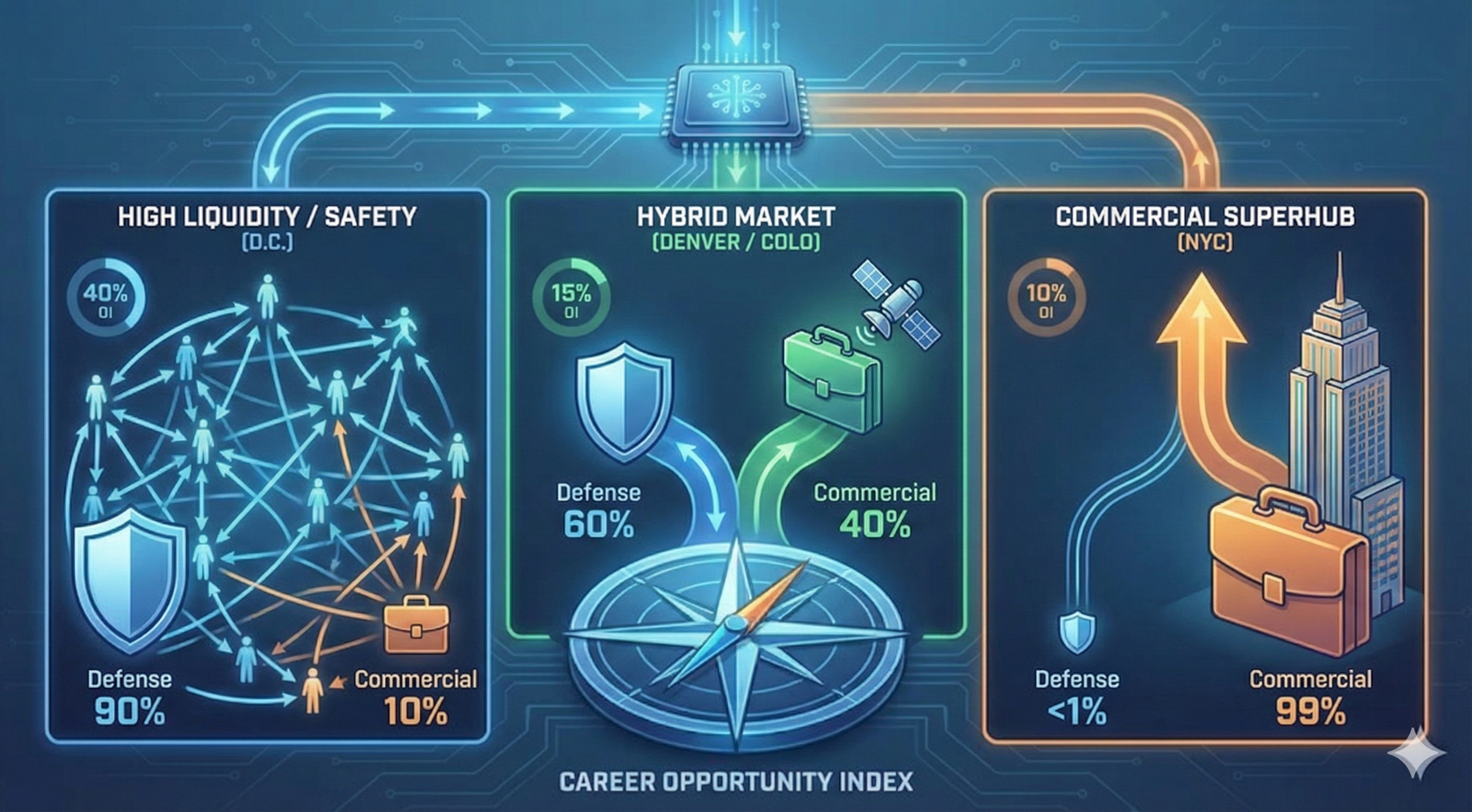 The 2026 landscape isn't just about who has a SCIF; it’s about Market Liquidity. In Washington D.C., the currency is your Clearance. But in the emerging commercial superhubs, the currency is your experience and adaptability to problems that cross multiple industries. To reflect this, we have updated the Geospatial Career Opportunity Index (OI) to include the massive commercial sectors that don't require a polygraph.